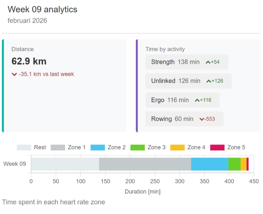 Tracklete now brings your weekly performance to life right on your overview page. Your key stats update automatically each week, giving you a clear snapshot of your progress without any extra effort. Instantly see your total distance, active minutes per sport, how your performance compares to last week, and how much time you spent in each heart rate zone — all without opening the Analysis page.